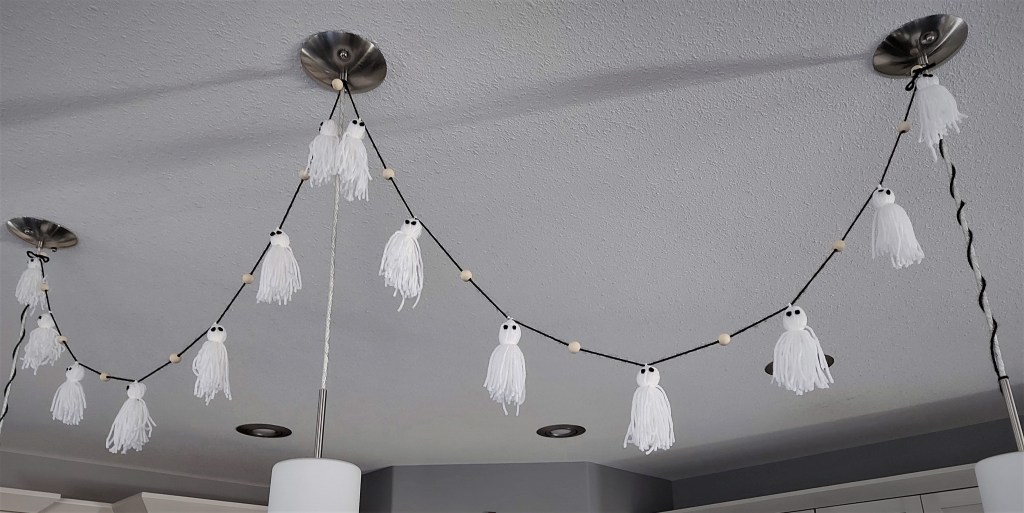 • There are two ways you could put your ghosts onto the yarn. I tied my ghosts onto the black yarn, that way I knew they wouldn’t slide around but you can also use a needle to thread the yarn through each ghosts head so they stay on the yarn as well.
