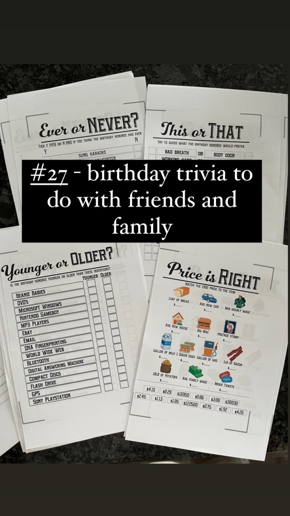Birthday trivia pages that I found and bought off of Etsy. It was fun to do with our siblings and parents! You can find them here.