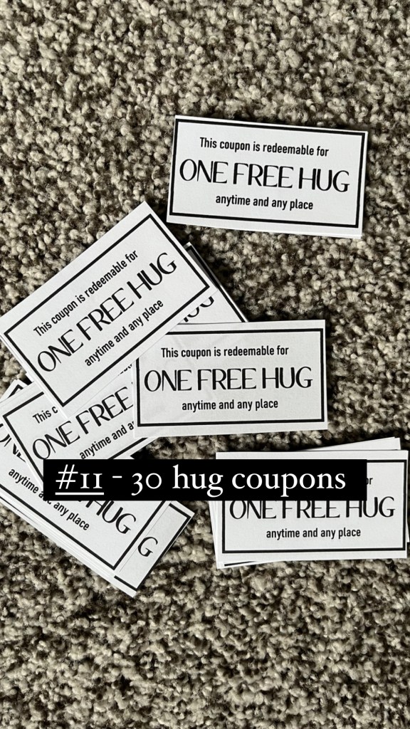 30 Post-it Notes of Affirmations. I wrote out things like “You Rock” “I love you!” “You are a handsome devil” and I spread the sticky notes all over his car. I also had a card that explained he would be receiving 30 surprises and gifts throughout the day with a chart to write them in.