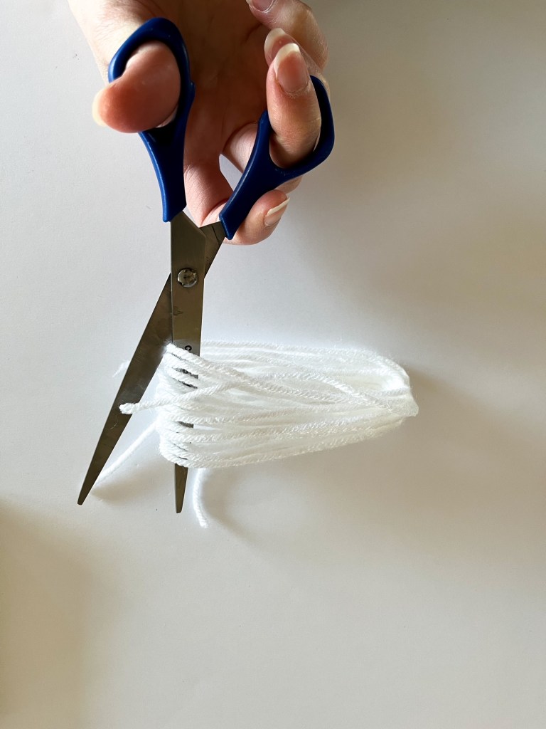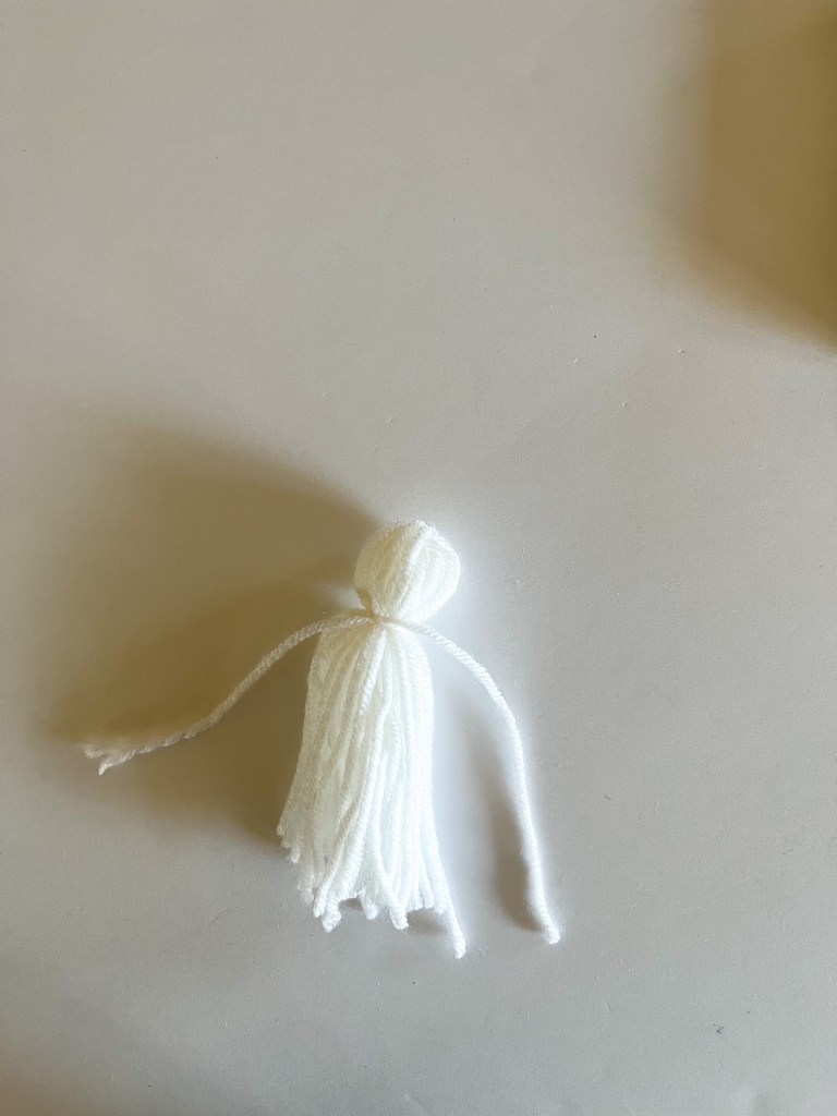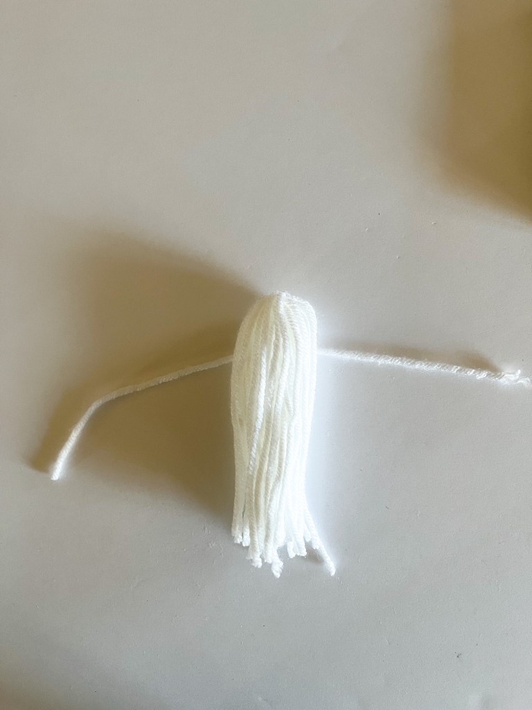 I wrapped it around 20 times to get the right amount of yarn for my tassels. Then use a piece of yarn to tie around the yarn on your book and cut the yarn apart at the bottom. Tie another piece of yarn around where you want the bobble part to be.