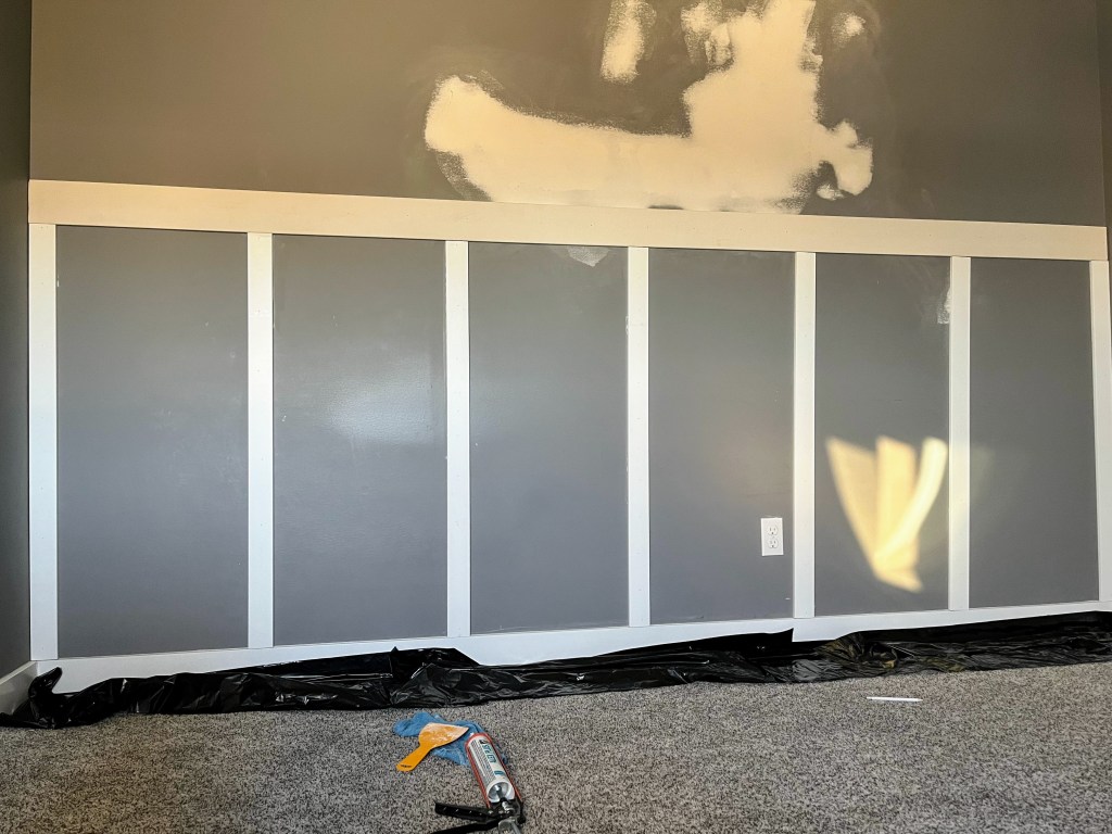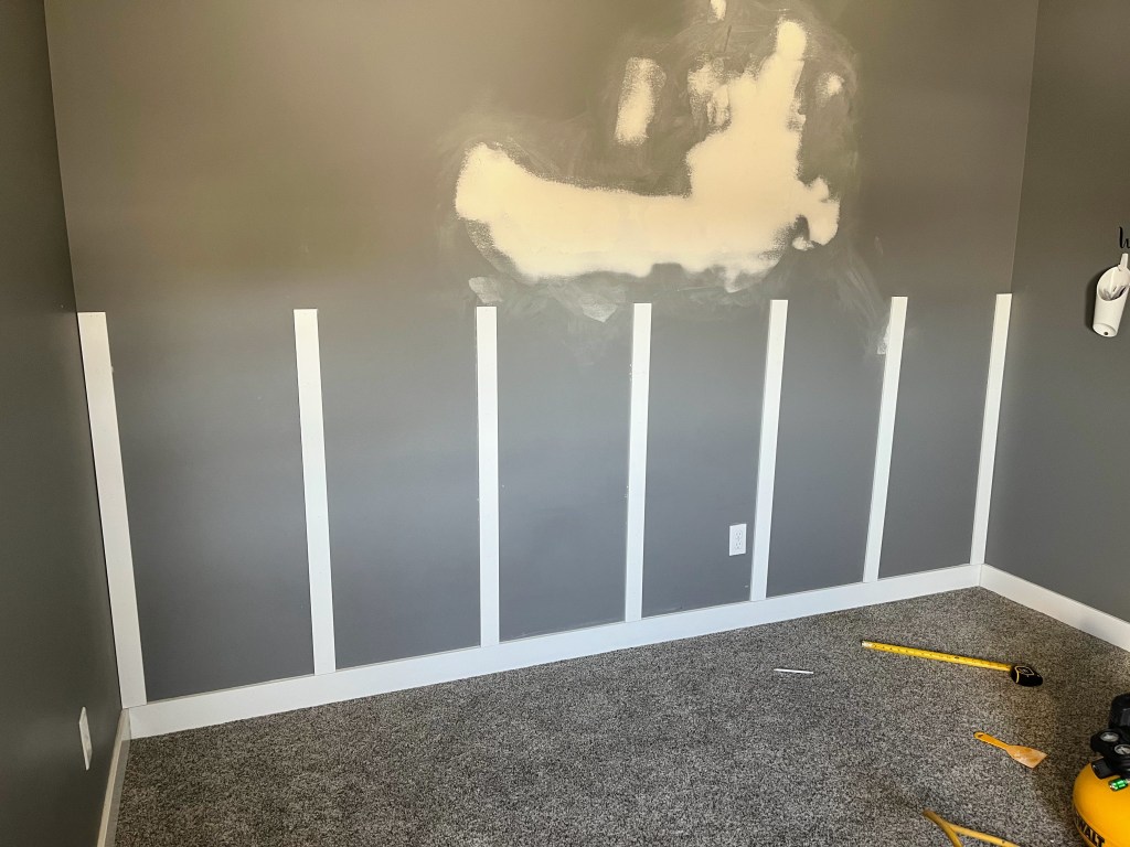 The wall was the biggest undertaking for this toddler room. I always loved seeing bedrooms with the board and batten so I did my research for a month and read up on several blogs and finally felt confident enough to try it! Before I put up the boards though, my father-in-law fixed up the ripped dry wall by mudding and sanding first. Thank goodness for handy family members to help me and teach me!