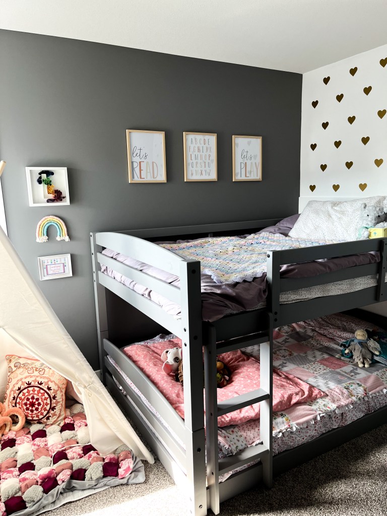The one downside that I have about the bed is that because it is a floor bunk, Laurel sometimes bumps her head on the top bunk getting in and out of the bed. Nothing major but it would be nice to have the option to raise the bed up higher when she is older.