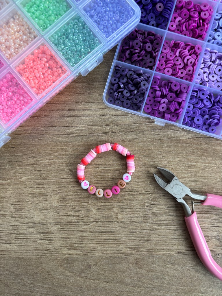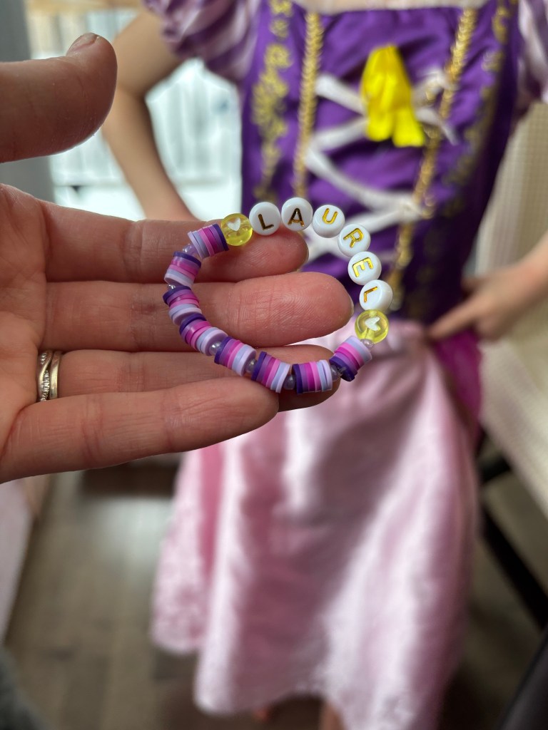 Laurel, my 4 year old is fully living out her princess era currently and so we created a Rapunzel themed bracelet for her. With my younger girl, Ellie, we went with a classic Valentine’s colour theme. This activity was too challenging for them to do on their own so I made the bracelet for them, but they had fun picking their colours and beads. It was a fun bonding activity with a beautiful outcome.