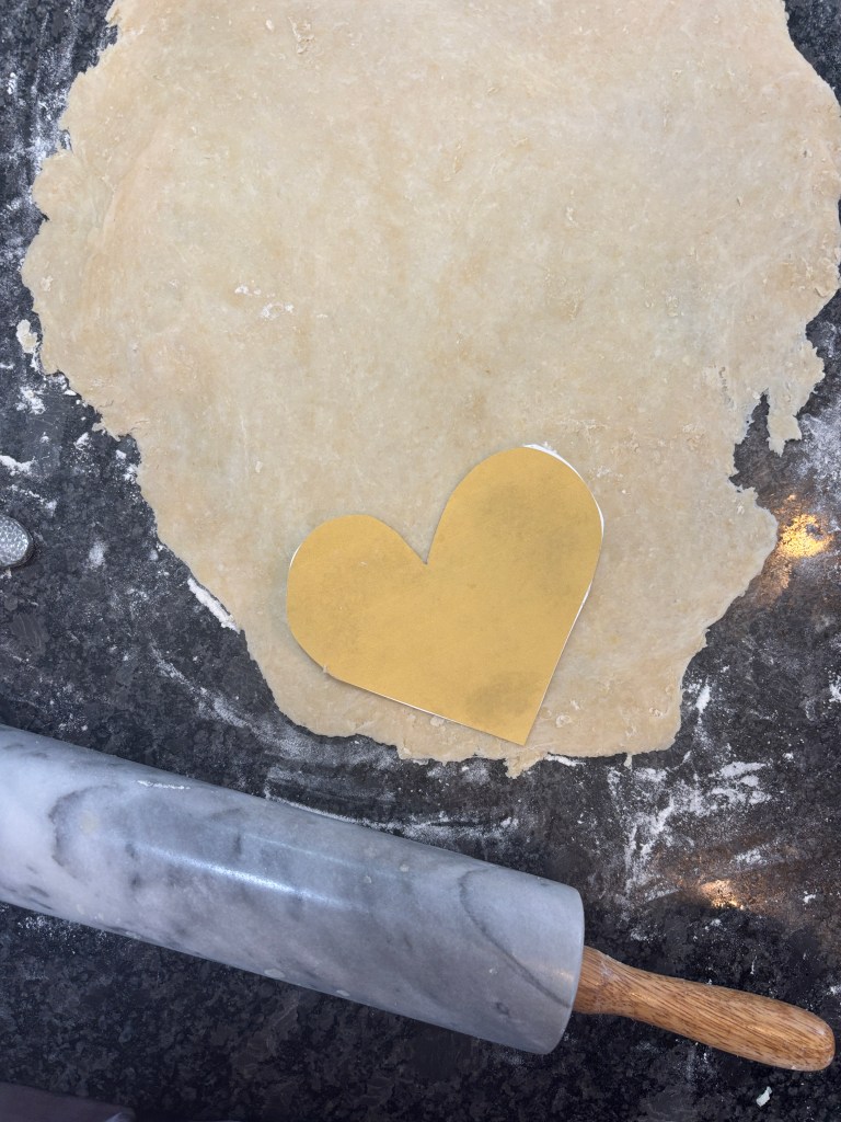 I rolled my dough out to about 1/8 inch thick on a floured surface and then used my heart template to cut out your heart shapes. **NOW after playing around with making the pies I cut my top pieces a bit larger than my bottom pieces. Just cut around the heart template an extra 1/4 inch.