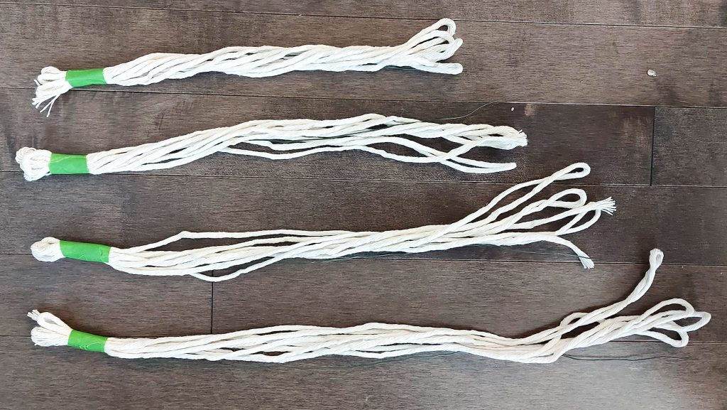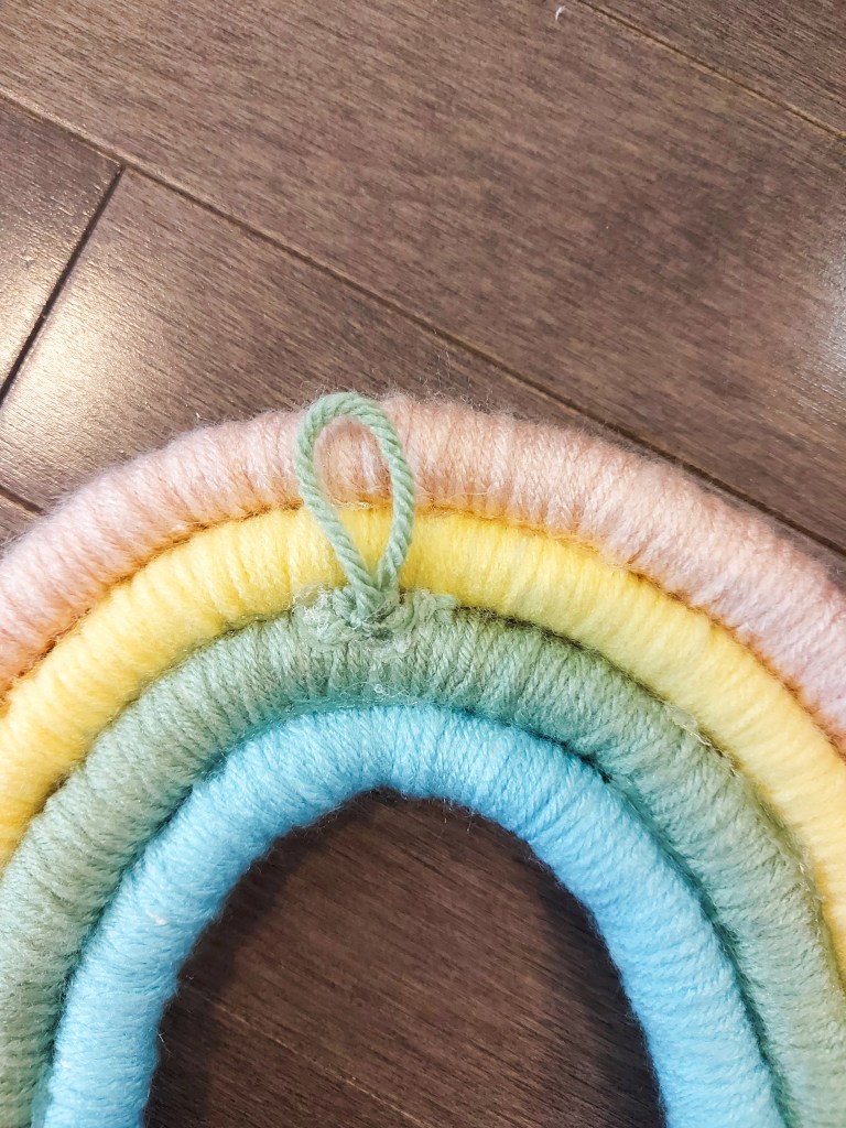 Fold your yarn in half and loop around the edge of your paper towel roll, placing the hanging yarn strands through the top hole. Pull tight and let the yarn hang. Do this until the entire paper towel roll is covered and can no longer be seen.