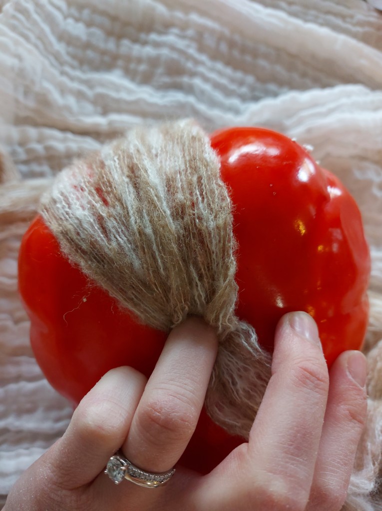 Find a book or item that is roughly 4 inches wide and not very thick to wrap your yarn around. I wrapped my yarn around my crochet bag 35 times to have the perfect amount of yarn for my ornament hat. Once you are done wrapping it. Cut one side so you have 35 strands of yarn.